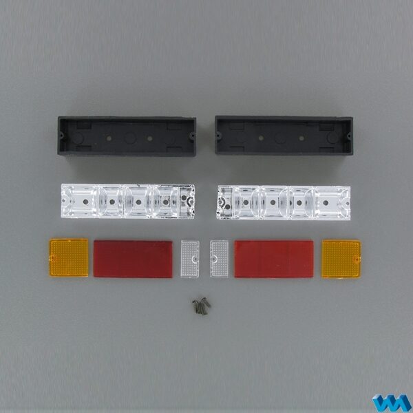 6 – chamber – tail lamps, suitable for scale 1:16 – 1:14.5, for truck`s, measure: total length 38mm, length glass 27mm, width 11mm, height 6,5mm, included: 2 housings reflecting inside, 2 red and 2 white glasses