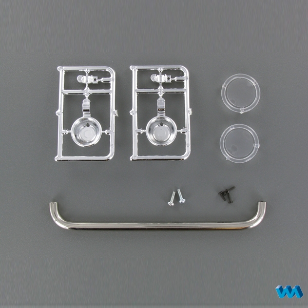 Front light holder MAN TGX, scale 1/14, holding bow with 2 headlamps, the holder buckled from brass and nickel-platedtand 2 lamps from plastic with clear glasses, you can retrofit them with bulbs or LED, included: 1 holder, 2 lamps with fixing screws