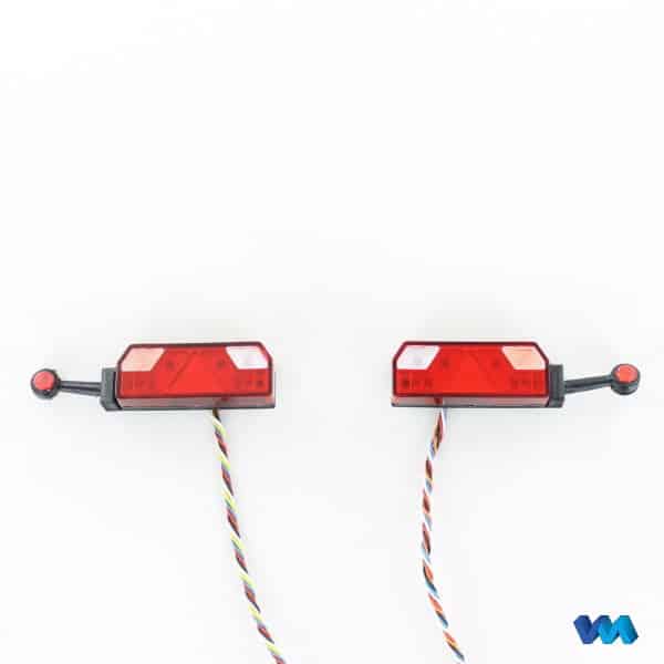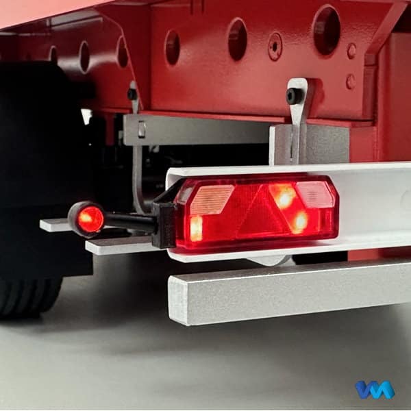 7-Kammer Rückleuchte mit Umrissleuchte und Beleuchtungsplatine in 7,2 Volt, passend für den Maßstab 1/16 – 1/14.5 , Anschlussfertig aufgebaut, Umrissleuchte aus flexiblem Gummi, LED weiss und rot leuchtend, mit Kunststoffeinsätzen für ein bessere Ausleuchtung der einzelnen Kammern, mit SMD-LEDs bestückt, gemeinsamer Pluspol, 4 Lichtfunktionen : Blinker, Rücklicht + Umrissleuchte, Bremslicht und Rückfahrlicht, Kabellänge ca. 60cm, Abm: LxBxH : 51x12x7mm, Inhalt: 1 Rückleuchte links, 1 Rückleuchte rechts, Anleitung
