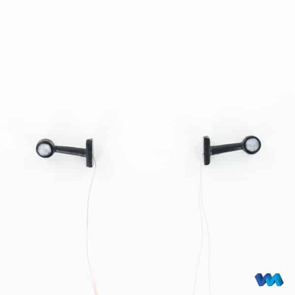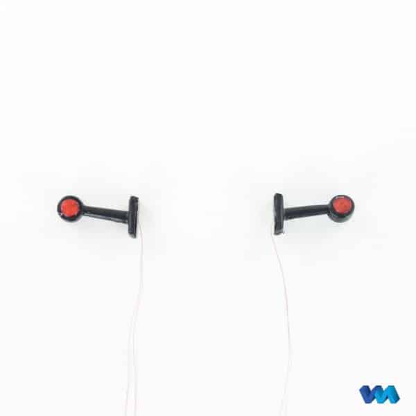 Umrissleuchten einzeln, Maßstab 1/16 bis 1/14,5, von 7,2 bis 12 Volt, aus flexiblem Gummi, LED weiss und rot leuchtend, mit 10cm langem Lackdraht, Abm.: Länge 18mm, Höhe 9mm, Breite 5mm, Sockel 9x4mm, befestigt wird die Leuchte mit Sekundenkleber, Inhalt: 1 rechte, 1 linke Umrissleuchte, Anleitung